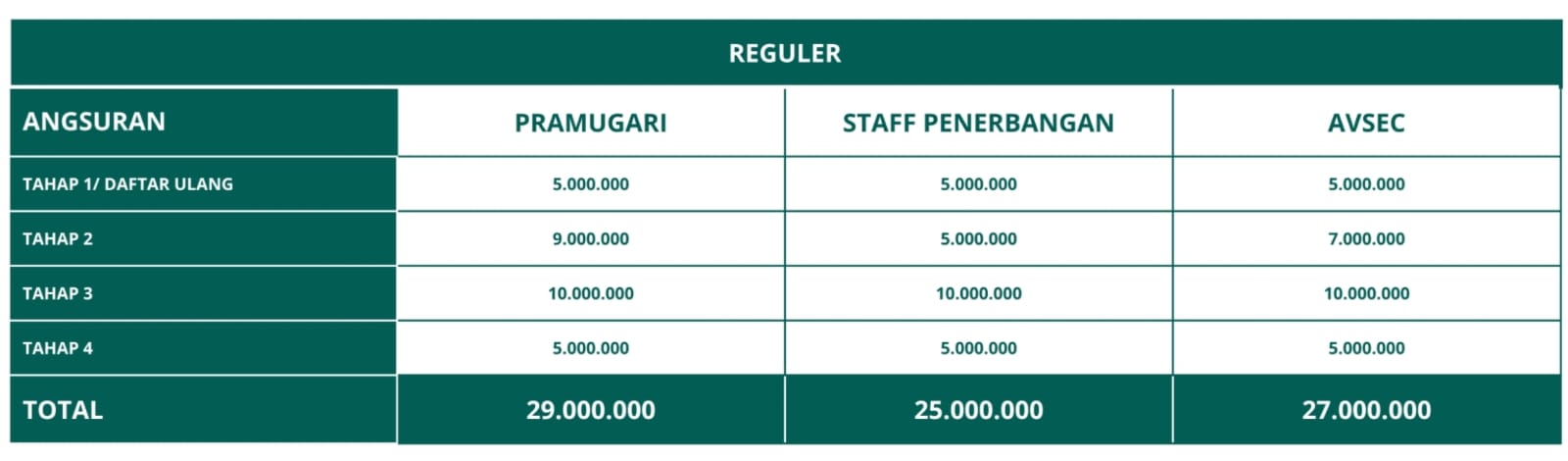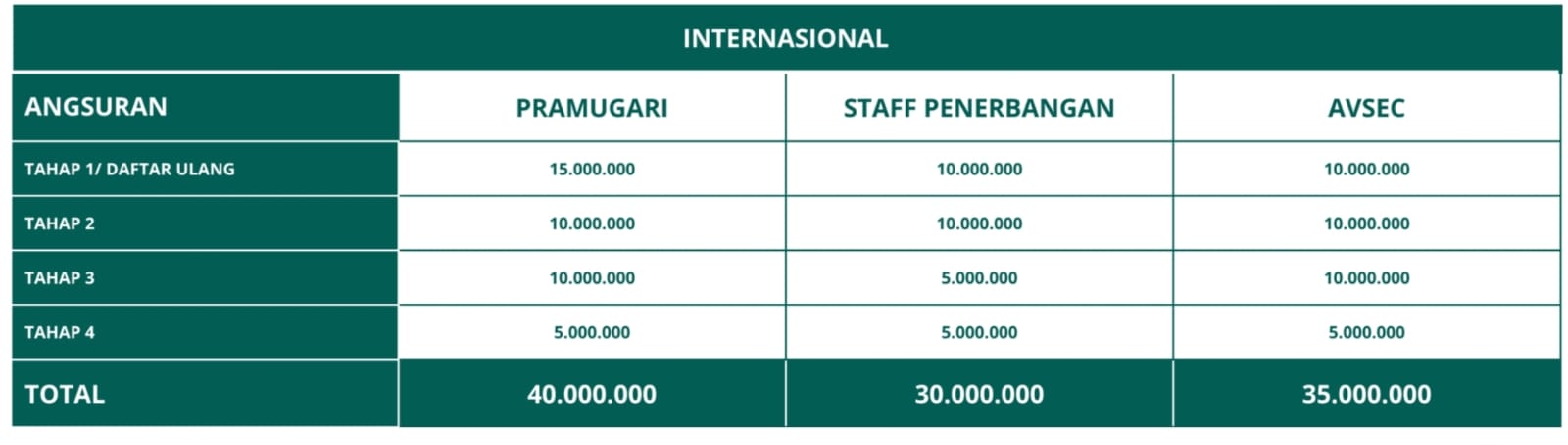 • Memiliki tinggi badan minimal: Pramugari 158 cm ; Staff Penerbangan Putra 165 cm Putri 157 cm ; Avsec Putra 168 cm Putri 162 cm